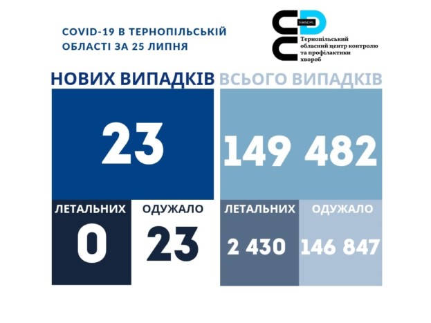 23 нових випадки коронавірусної хвороби COVID-19 зафіксовано в Тернопільській області за 25 липня 2022 року. Про це повідомляє Державна установа «Тернопільський ОЦКПХ МОЗ України».