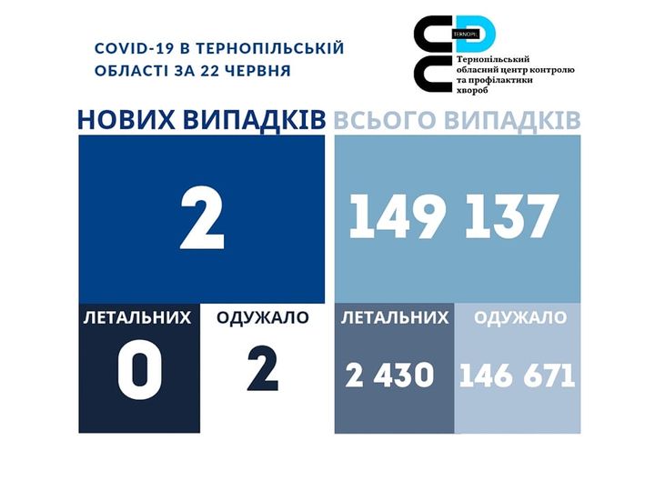 2 нових випадки коронавірусної хвороби COVID-19 зафіксовано в Тернопільській області за 22 червня 2022 року. Про це повідомляє Державна установа «Тернопільський ОЦКПХ МОЗ України»