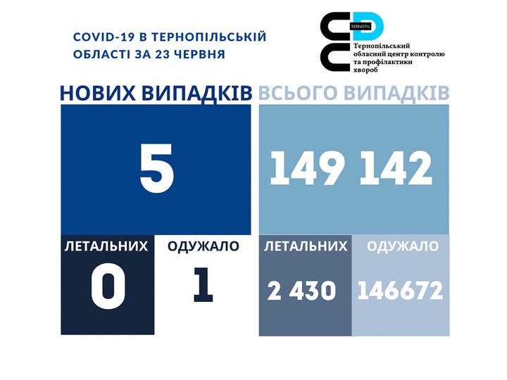 5 нових випадків коронавірусної хвороби COVID-19 зафіксовано в Тернопільській області за 23 червня 2022 року. Про це повідомляє Державна установа «Тернопільський ОЦКПХ МОЗ України»