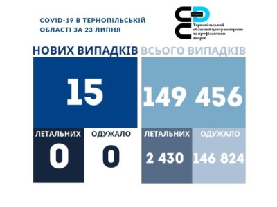 15 нових випадків коронавірусної хвороби COVID-19 зафіксовано в Тернопільській області за 23 липня 2022 року. Про це повідомляє Державна установа «Тернопільський ОЦКПХ МОЗ України».