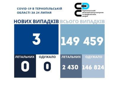 Три нових випадки коронавірусної хвороби COVID-19 зафіксовано в Тернопільській області за 24 липня 2022 року. Про це повідомляє Державна установа «Тернопільський ОЦКПХ МОЗ України».