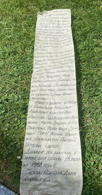 Документ цей заховано в землю біля церкви 18 серпня 1968 року. Писала Рокіцька Дарія Ярославівна”.