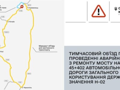 Як повідомляє Служба відновлення та розвитку інфраструктури у Тернопільській області, причина – проведення аварійно-відновлювальних робіт на мосту, ділянка від міста Кременець у напрямку Почаєва.