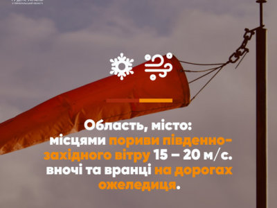 Місто: 25 лютого вдень пориви південно-західного вітру 15-20 м/с. 25-26 лютого вночі та вранці на дорогах ожеледиця.