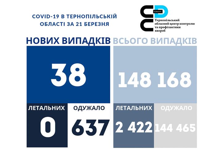 38 нових випадків коронавірусної хвороби COVID-19 заф іксовано в Тернопільській області за 21 березня 2022 року. Про це повідомляє Державна установа «Тернопільський ОЦКПХ МОЗ України»