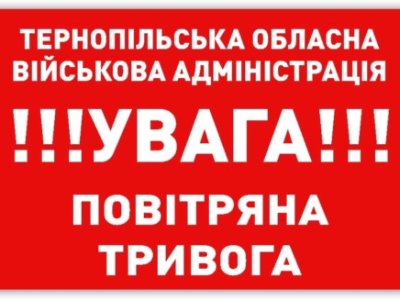 «Громадяни! Повітряна тривога! Відключіть світло, газ, воду, погасіть вогонь у печах. Візьміть засоби індивідуального захисту, документи, запас харчів та води і вийдіть на вулицю. Попередьте сусідів, допоможіть людям похилого віку та хворим. Якнайшвидше дістаньтеся захисної споруди або заховайтеся на місцевості. Дотримуйтеся порядку, зберігайте спокій, за будь-яких обставин не віддавайтеся паніці. Будьте до наступних повідомлень Тернопільської обласної держаної адміністрації та місцевих органів виконавчої влади», – йдеться в повідомленні ТОДА.