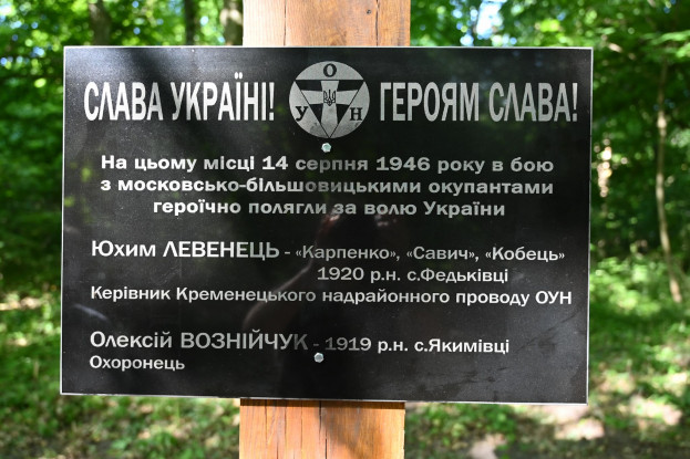 На місці, де 14 серпня 1946 року в бою з московсько-більшовицькими окупантами героїчно полягли Юхим Левенець «Карпенко», «Савич», «Кобець» – керівник Кременецького надрайонного проводу ОУН та його охоронець Олексій Вознійчук, відбулося освячення пам’ятного знаку.