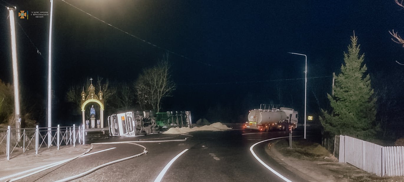 В селищі Нагірянка, що на Тернопільщині перекинулася автоцистерна, яка перевозила бензин. На крутому повороті водій не впорався з керуванням і допустив перекидання бензовоза. Аби убезпечити життя місцевих мешканців, було евакуйовано 10 людей.