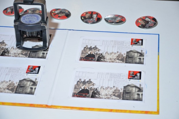 На значкові – фото Михайла та Розалій Бандер на фоні червоно-чорного прапора, а також місце здійснення спецпогашення марки.