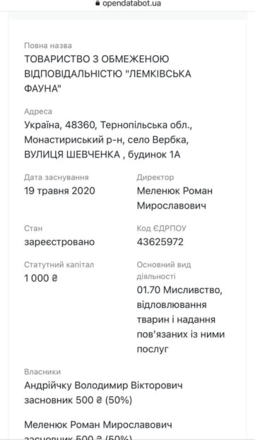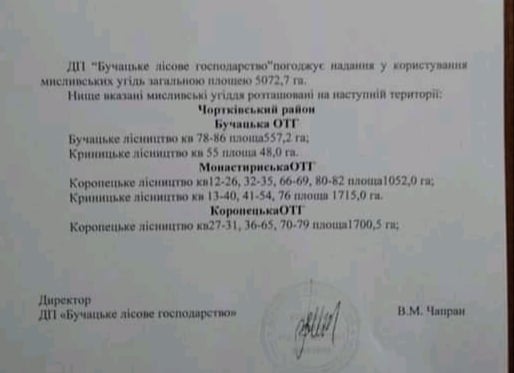 – В той час, коли моя Монастирищина вже цілий рік гнеться від ковіду та від бездіяльності місцевої влади, деякі ділки, які не мають жодного відношення до нашого краю, провертають масштабну лісову аферу з нашими державними лісами. Випадково натрапила на інформацію (на фото – авт.), де мене здивувала дивна назва ТОВ «Лемківська фауна». Так я є членкинею в громадській організації Монастириська районна організація українського товариства мисливців і рибалок, ця тема мене дуже зацікавила. Як більше 5 тис. га нашого державного лісу могли за плечима нашої громади перейти у користування на 49 років ТОВ «Лемківська фауна» з статутним капіталом 1 000 грн.? Ці ліси передало ДП «Бучацьке лісове господарство» на підставі звичайного договору! Ви забрали пане О. Яремко (керівник Тернопільського обласного управління лісового та мисливського господарства – авт.) у нашої громади більше року тому Монастириські ТМР ліси, щоби зараз їх віддати підставним людям у приватну власність!? Як такі речі взагалі можуть реалізуватися в моєму краю?, – дивується громадський активіст з Монастириська Ірина Ванат.