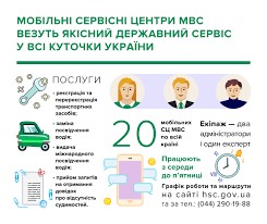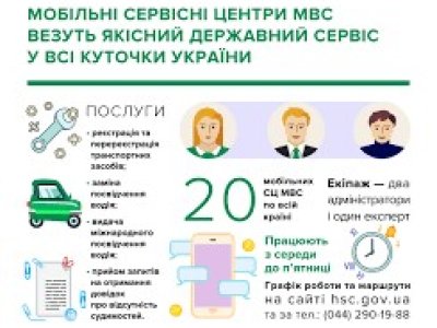 Інформацію про роботу мобільного сервісного центру МВС області можна отримати на сайті Головного сервісного центру МВС hsc.gov.ua та за телефоном (044) 290-19-88.