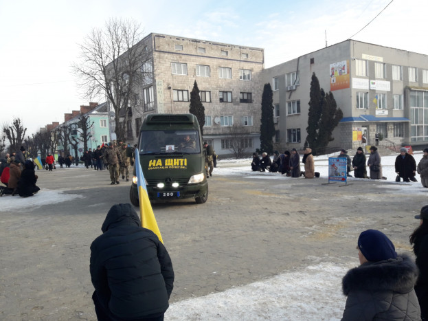 На колінах, з державними прапорами зустріли та провели в останню дорогу додому, кортеж із тілом загиблого Героя, захисника України – Василя Сушанина жителі Борщівської громади.
