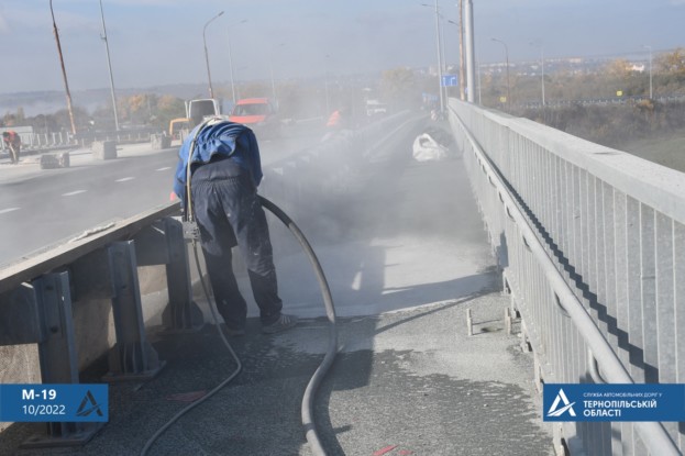 Напередодні підрядна організація відновила ремонт. На прогоновій будові проводять піскоструменеве очищення розподільчої плити та тротуарів. Під шляхопроводом бетонують конуси. На тротуарах влаштовують захисне покриття.