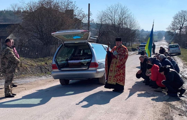 Дорогою додому тіло з домовиною зустрічали люди біля населених пунктів, аби в скорботі на колінах вшанувати Воїна, який віддав своє життя за свободу і незалежність України, за мирне життя кожного з нас.