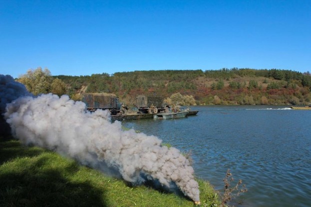 На понтон завантажують техніку. Для прикриття під час переправи використовують димову завісу, також зазвичай працює РЕБ.