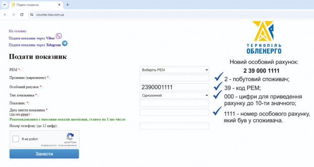 У випадках самостійного передавання показників електролічильників за допомогою онлайн способів (Viber, Telegram, сайт) потрібно вводити особові рахунки в новому форматі. В той же час, до 15 серпня 2024 р., можна передавати показники електролічильників за старим та новим форматом особових рахунків.