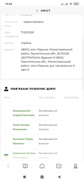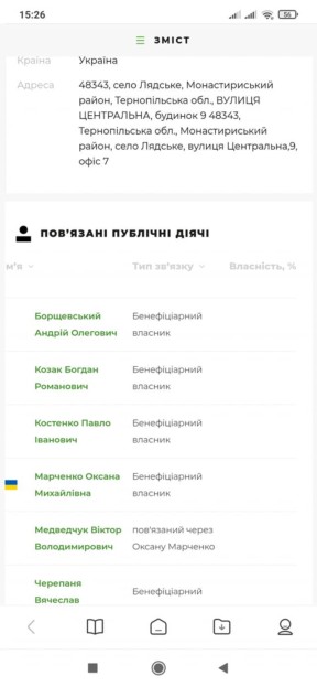 В обох цих підприємствах є кілька кінцевих бенефіціантів, серед них Оксана Марченко, дружина одіозного Віктора Медведчука з реєстрацією у Києві, у Солом’янському районі на вулиці Медвинській (будинок 24, квартира 1).