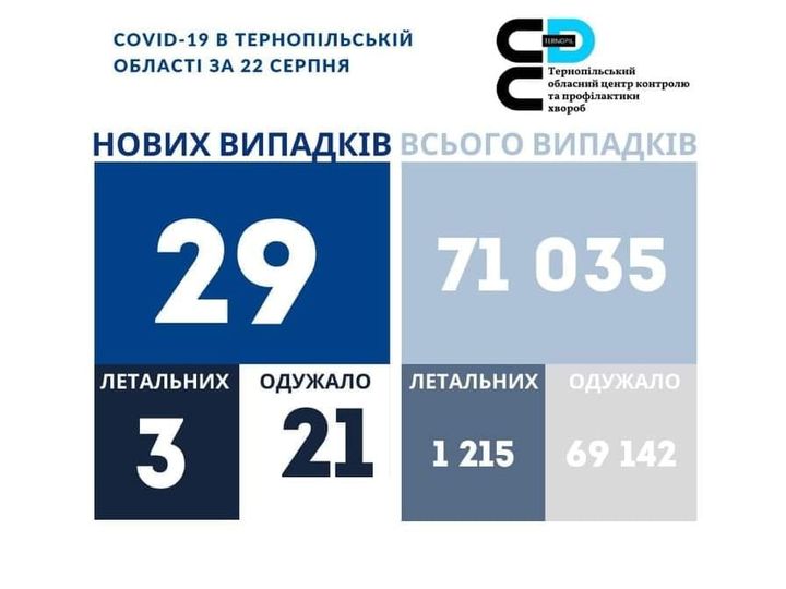 29 нових випадки коронавірусної хвороби COVID-19 зафіксовано в Тернопільській області за 22 серпня. Про це повідомляє Державна установа «Тернопільський ОЦКПХ МОЗ України».