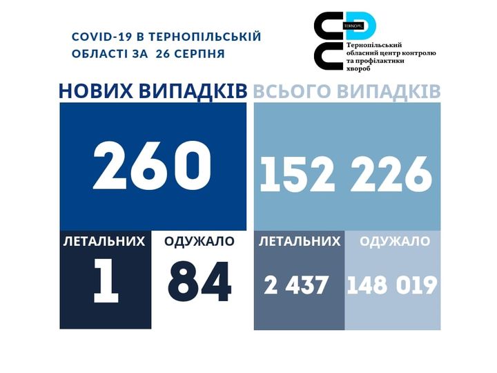 260 нових випадків коронавірусної хвороби COVID-19 зафіксовано в Тернопільській області за 26 серпня 2022 року. Про це повідомляє Державна установа «Тернопільський ОЦКПХ МОЗ України».