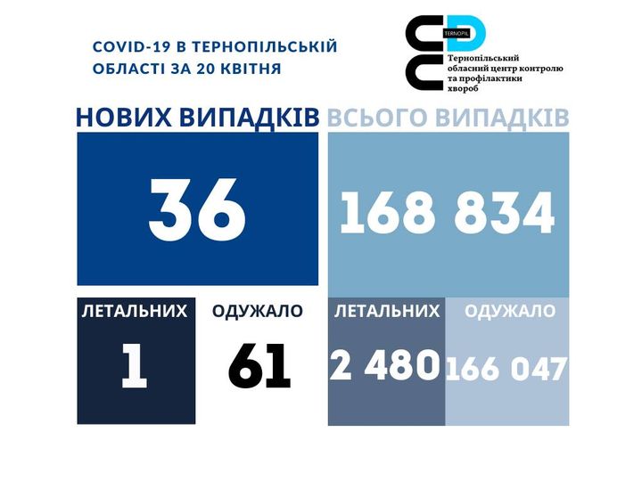 36 нових випадки коронавірусної хвороби COVID-19 зафіксовано в Тернопільській області за 20 квітня 2023 року. Про це повідомляє Державна установа «Тернопільський ОЦКПХ МОЗ України».