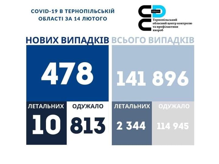 478 нових випадків коронавірусної хвороби COVID-19 зафіксовано в Тернопільській області за 14 лютого 2022 року. Про це повідомляє Державна установа «Тернопільський ОЦКПХ МОЗ України».