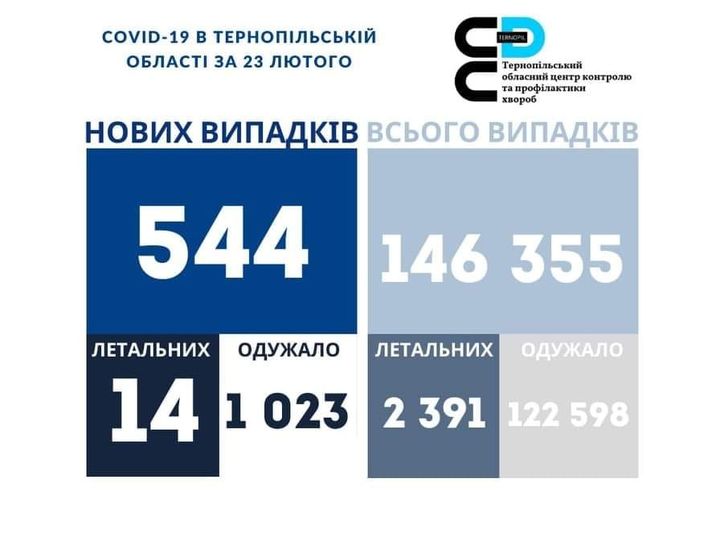 544 нових випадків коронавірусної хвороби COVID-19 зафіксовано в Тернопільській області за 23 лютого 2022 року. Про це повідомляє Державна установа «Тернопільський ОЦКПХ МОЗ України».