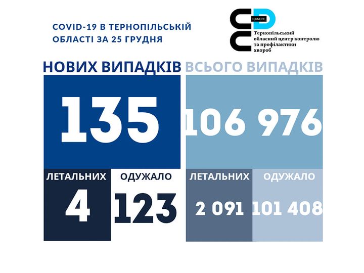 135 нових випадків коронавірусної хвороби COVID-19 зафіксовано в Тернопільській області за 25 грудня 2021 року. Про це повідомляє Державна установа «Тернопільський ОЦКПХ МОЗ України».