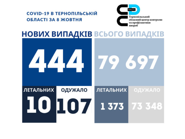 444 новий випадки коронавірусної хвороби COVID-19 зафіксовано в Тернопільській області за 8 жовтня. Про це повідомляє  Державна установа «Тернопільський ОЦКПХ МОЗ України».