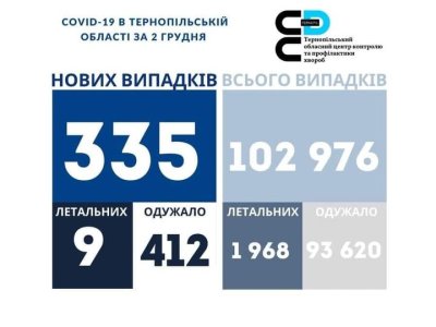 335 нових випадків коронавірусної хвороби COVID-19 зафіксовано в Тернопільській області за 2 грудня 2021 року. Про це повідомляє Державна установа «Тернопільський ОЦКПХ МОЗ України»