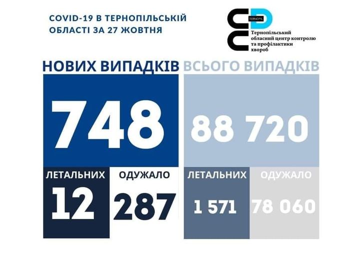 748 нових випадів коронавірусної хвороби COVID-19 зафіксовано в Тернопільській області за 27 жовтня. Про це повідомляє Державна установа «Тернопільський ОЦКПХ МОЗ України»