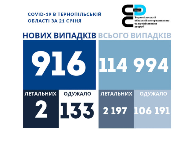 916 нових випадки коронавірусної хвороби COVID-19 зафіксовано в Тернопільській області за 21 січня 2022 року. Про це повідомляє Державна установа «Тернопільський ОЦКПХ МОЗ України».