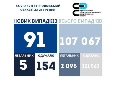 91 новий випадок коронавірусної хвороби COVID-19 зафіксовано в Тернопільській області за 26 грудня 2021 року. Про це повідомляє Державна установа «Тернопільський ОЦКПХ МОЗ України».