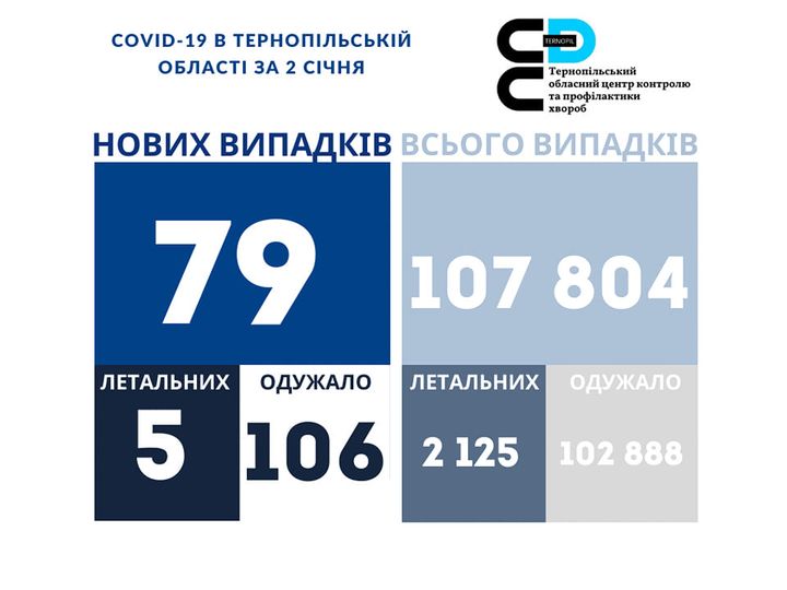 79 нових випадків коронавірусної хвороби COVID-19 зафіксовано в Тернопільській області за 2 січня 2021 року. Про це повідомляє Державна установа «Тернопільський ОЦКПХ МОЗ України».