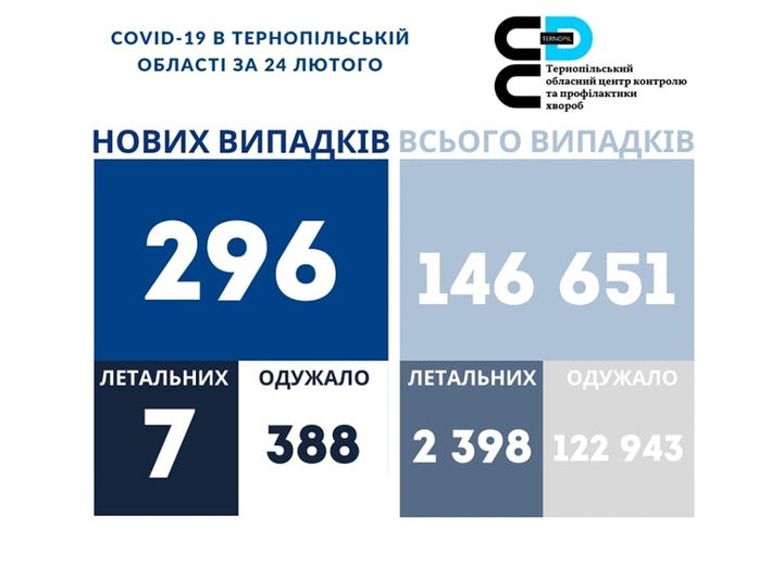 296 нових випадків коронавірусної хвороби COVID-19 зафіксовано в Тернопільській області за 24 лютого 2022 року. Про це повідомляє Державна установа «Тернопільський ОЦКПХ МОЗ України».