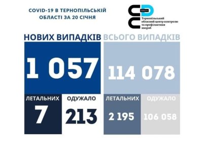 1 057 нових випадків коронавірусної хвороби COVID-19 зафіксовано в Тернопільській області за 20 січня 2022 року. Про це повідомляє Державна установа «Тернопільський ОЦКПХ МОЗ України».