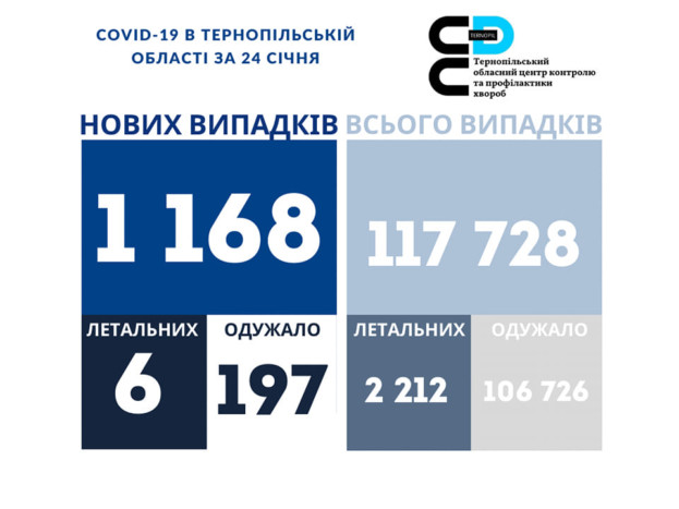 1 168 нових випадків коронавірусної хвороби COVID-19 зафіксовано в Тернопільській області за 24 січня 2022 року. Про це повідомляє Державна установа «Тернопільський ОЦКПХ МОЗ України».