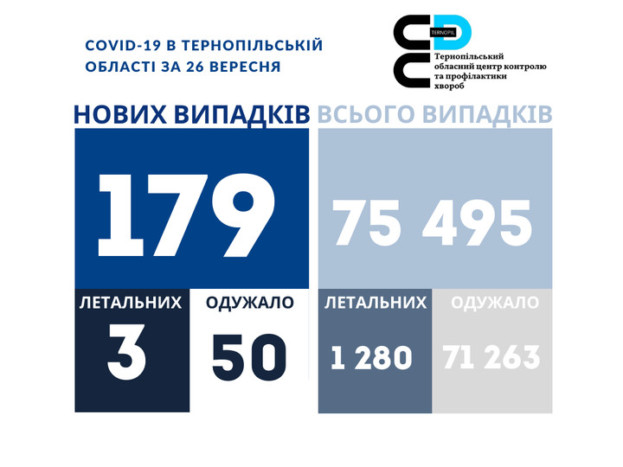 179 нових випадків коронавірусної хвороби COVID-19 зафіксовано в Тернопільській області за 26 вересня. Про це повідомляє  Державна установа «Тернопільський ОЦКПХ МОЗ України».