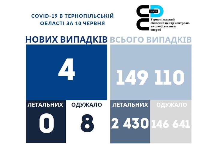 4 нових випадки коронавірусної хвороби COVID-19 заф іксовано в Тернопільській області за 10 червня 2022 року. Про це повідомляє Державна установа «Тернопільський ОЦКПХ МОЗ України»