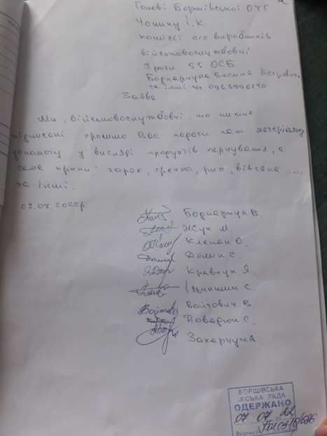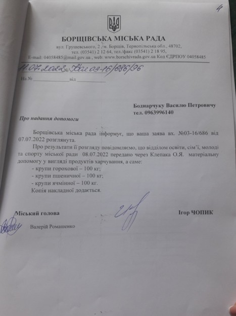 Міська рада Борщева не забарилася з відповіддю: «Сьогодні вкотре на Інтернет ресурсах поширена неправдива інформація по діяльність міської ради щодо надання допомоги нашим захисникам. До міської ради звернулись військовослужбовці 55 бригади, яка на даний час дислокується в одному із міст Чортківського району, щодо надання гуманітарної допомоги. Міською радою 25.06.2022 року передано продукти харчування, консерви, засоби гігієни, спальні мішки, медикаменти, ліхтарики, павербанки до телефонів, печиво, турнікети та інше. Після чергового звернення від цих військовослужбовців 08.07.2022 року міською радою передано для потреб 55 бригади 100 кг  крупи гороху, 100 кг крупи пшеничної, 100 кг крупи ячмінної. 18.07.2022 року передано 200 кг крупи гороху, цукор та сіль, які були в наявності, а також запропоновано крупу пшеничну та ячмінну від яких війсьвослужбовці відмовились».