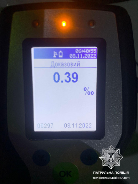 Сьогодні, 8 листопада, близько 7-ї, під час несення служби на стаціонарному посту, інспектори помітили водія вантажівки DAF, який не надав перевагу в русі транспортним засобам, що рухалися у супроводі спецтранспорту та спробував здійснити рух в колоні.Патрульні зупинили автомобіль та, спілкуючись з водієм, виявили в нього явні ознаки алкогольного сп’яніння. Охоронці порядку запропонували чоловікові пройти огляд на стан сп’яніння на місці зупинки за допомогою алкотесту Драгер, на що останній погодився. Результат огляду виявився позитивним, прилад зафіксував 0.39 проміле алкоголю в крові громадянина.