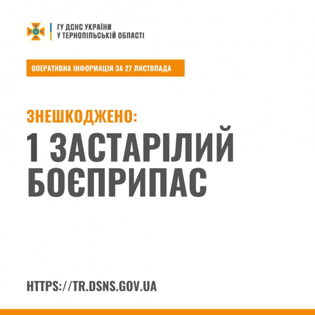 27 листопада групою піротехнічних робіт АРЗ СП ГУ ДСНС України у Тернопільській області вилучено та знешкоджено артилерійський снаряд, калібром 76 мм, виявлений напередодні поблизу с. Мечищів Саранчуківської ТГ Тернопільського району.