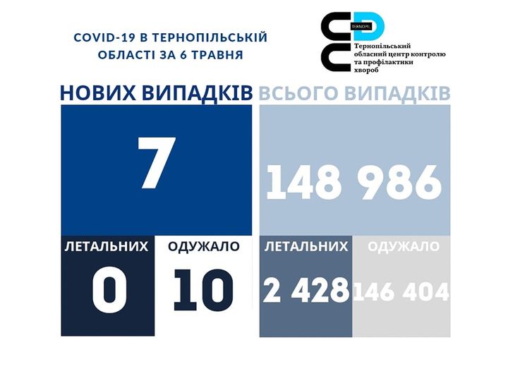 7 нових випадків коронавірусної хвороби COVID-19 заф іксовано в Тернопільській області за 6 травня 2022 року. Про це повідомляє Державна установа «Тернопільський ОЦКПХ МОЗ України»