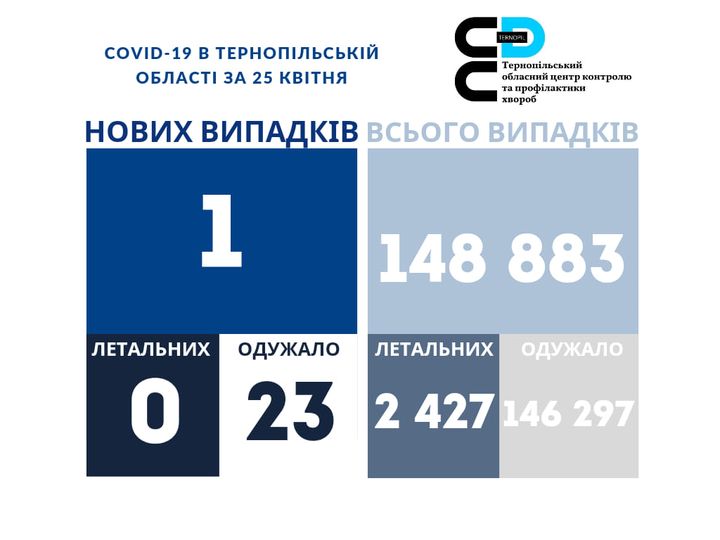 1 новий випадкок коронавірусної хвороби COVID-19 заф іксовано в Тернопільській області за 25 квітня 2022 року. Про це повідомляє Державна установа «Тернопільський ОЦКПХ МОЗ України»