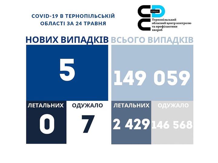 5 нових випадкіів коронавірусної хвороби COVID-19 зафіксовано в Тернопільській області за 24 травня 2022 року. Про це повідомляє Державна установа «Тернопільський ОЦКПХ МОЗ України»