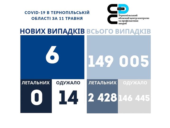6 нових випадків коронавірусної хвороби COVID-19 заф іксовано в Тернопільській області за 11 травня 2022 року. Про це повідомляє Державна установа «Тернопільський ОЦКПХ МОЗ України»