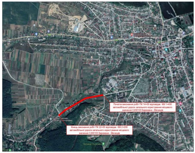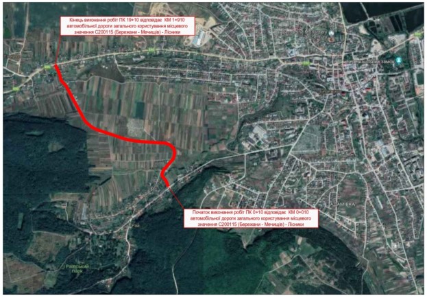 Та поточний середній ремонт автомобільної дороги загального користування місцевого значення С200115 (Бережани – Мечищів) – Лісники Тернопільської області – 1900 метрів погонних капітального асфальтового покриття шириною 4,5 метра+обочини. Дорога між Раєм та Лісниками!