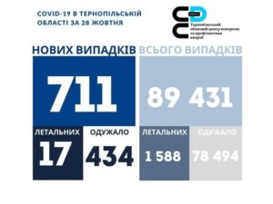 711 нових випадів коронавірусної хвороби COVID-19 зафіксовано в Тернопільській області за 28 жовтня 2021 року.
