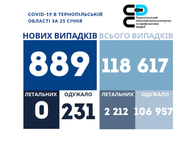 889 нових випадки коронавірусної хвороби COVID-19 зафіксовано в Тернопільській області за 25 січня 2022 року. Про це повідомляє Державна установа «Тернопільський ОЦКПХ МОЗ України».