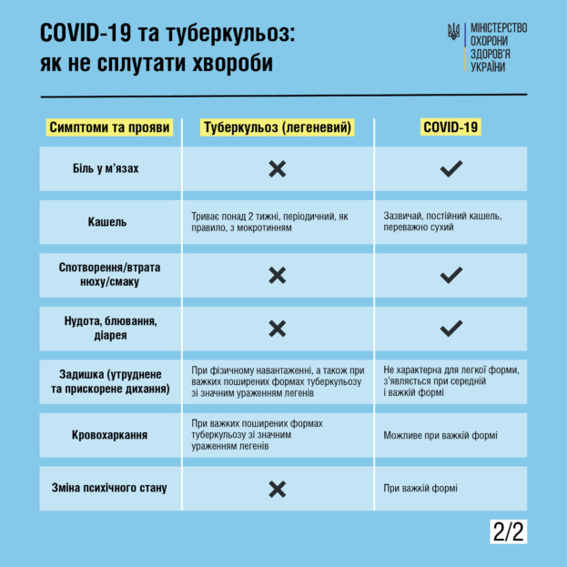 Як правило, туберкульоз не проявляється швидко: початок захворювання може розтягнутися на кілька тижнів, а інколи – місяців. Хворобі COVID-19 притаманний гострий перебіг протягом тижня та загальна тривалість близько двох тижнів.