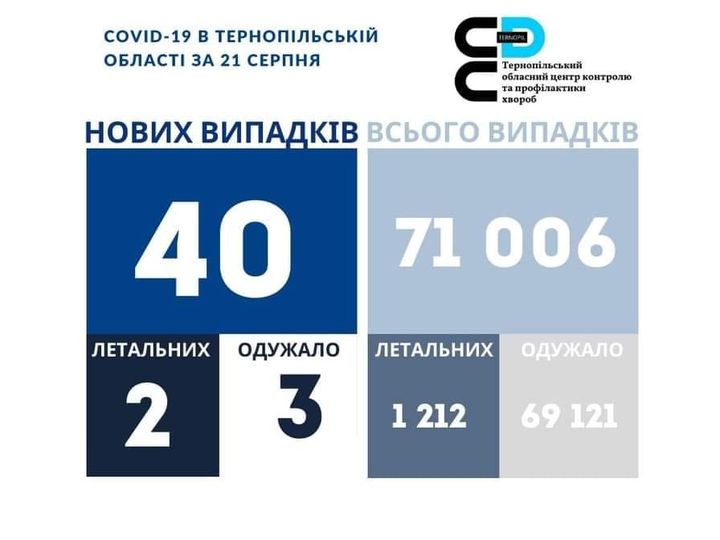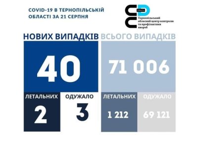 40 нових випадків коронавірусної хвороби COVID-19 зафіксовано в Тернопільській області за 21 серпня 2021 року. Про це повідомляє  Державна установа «Тернопільський ОЦКПХ МОЗ України».